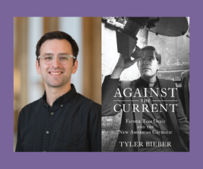 Left: Tyler Bieber, author. Right: book cover of “Against the Current, Father Tom Oddo and the New American Catholic.”